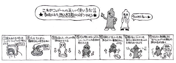 コンドームの正しい使い方 コンドームは正しく使うことが大切です。コンドームの正しい使い方は以下の図をごらんください(クリックすると拡大します)。 女性用コンドーム 女性が自ら使えるコンドームです。薬局などで購入できます。