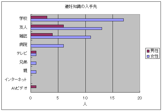 このグラフにはとても興味深い結果が出ています。女性は学校、友人など「誰かに聞いた避妊の知識」が主たるものであり、中には避妊の知識を病院で得た人もいるのに対し、男性はAVビデオで得た知識という回答があり、さらには病院で避妊の知識を得た人はまったくいません。女性は知識共有派であるのに対し、男性は独学派ということなのでしょうか。