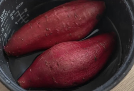 さつまいもを重ならないように並べ、さつまいもの半分が浸かる程度の水をいれ、玄米モードで炊く。