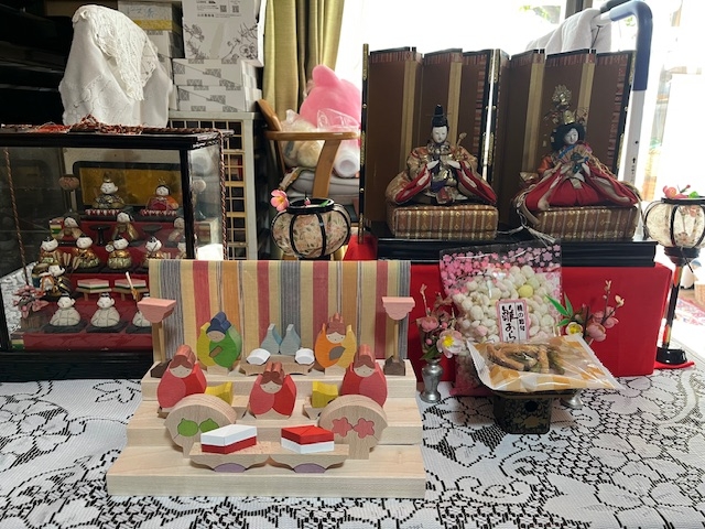 真ん中の木彫りのひな人形は昨年のもの、うしろのふたつのひな人形はなんと60年前のひな人形だそうです。