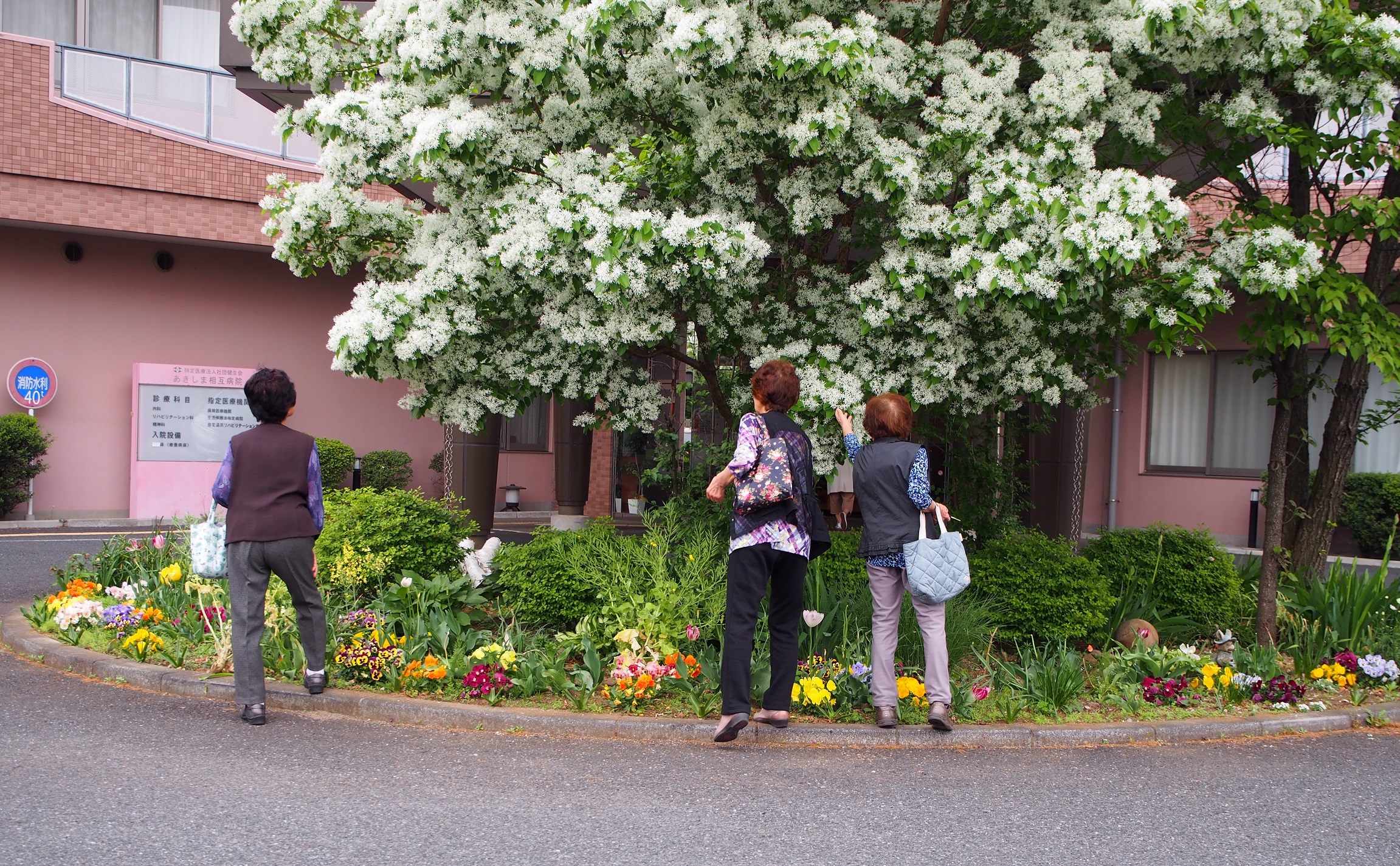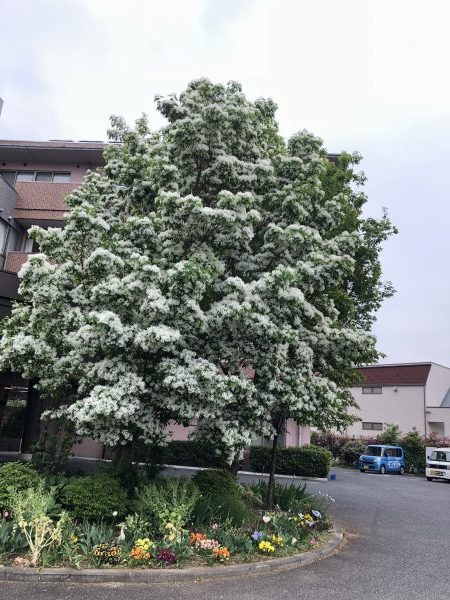なんじゃもんじゃ の木が満開になりました 病院の玄関前にあるなんじゃもんじゃが今年も満開です。桜と同じように昨年より1週間ほど早く、連休前の満開となりました。まるで雪が積もったような姿に、おとづれた方もしばし見入っていらっしゃいました