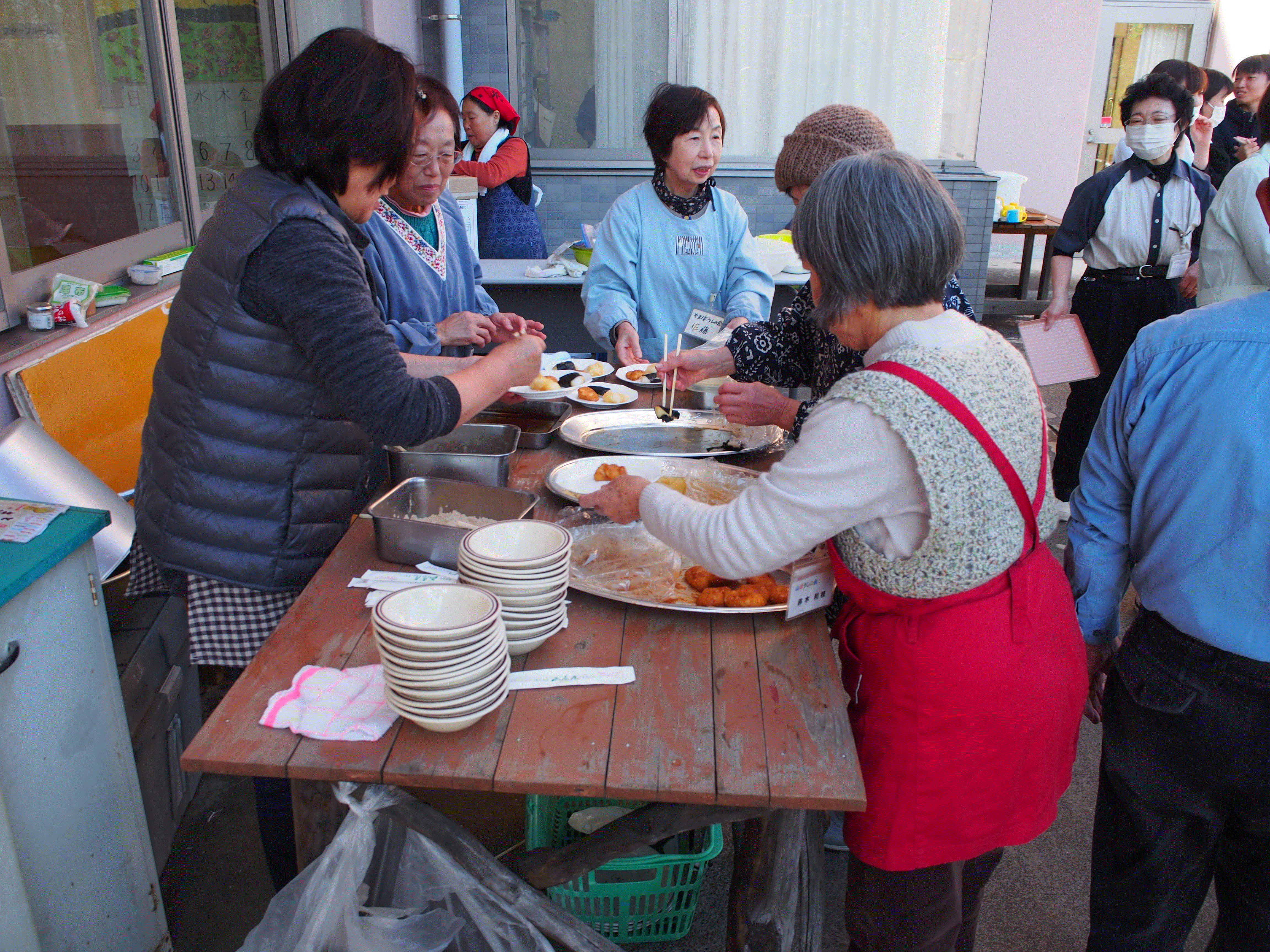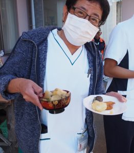 「わっ~おいしそう」、「どうぞどうぞ」、「いっぱい食べてね」と庭には患者・利用者様、スタッフ、やまぼうしの方など大勢の人が。院内のスタッフは良い匂いと盛況な声に引き込まれそうになってしまいました。