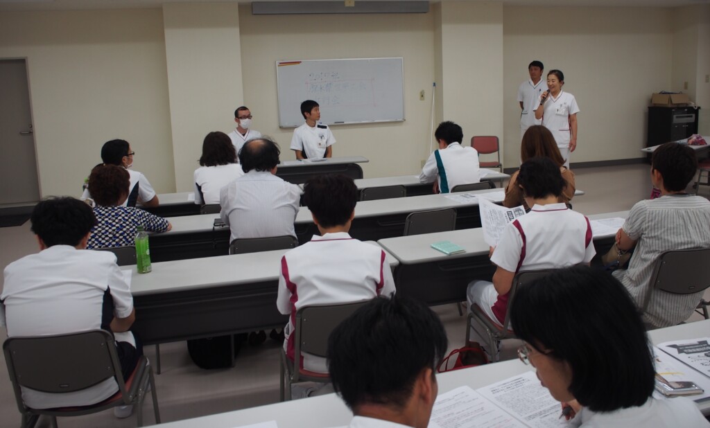 全日本民医連に加盟する全国の医療・介護施設から、今年も原水爆禁止世界大会に多くの職員が参加します。あきしま相互病院からも理学療法士と看護師の2名が長崎の大会に参加することになりました。派遣費用を捻出するために各職場が創意工夫して食べ物や物品販売を行い、この時期の院内はとても賑やかになります。折鶴も準備し、代表となった2名は送り出す職員の激励の言葉と一緒に長崎に出発します。