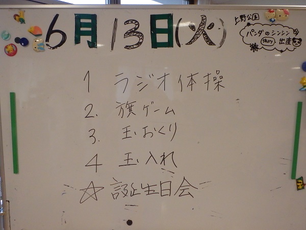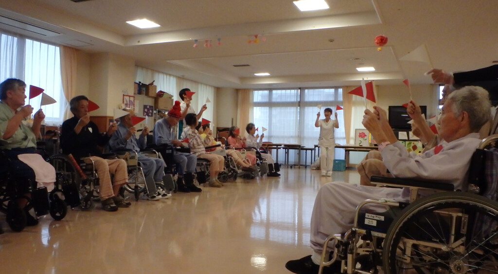 6月13日にさくら病棟で運動会が開催されました。患者さん方は紅白のグループに分かれ、旗揚げや玉送り、玉入れなどをされました。玉送りでは患者さん同士で協力し合い隣の人へと渡していき、病棟スタッフも加わり熱い闘いとなりました。紅白のグループに分かれましたが、患者さんが楽しそうに参加されている姿は勝敗に関わらず、かけがえのないものでした。