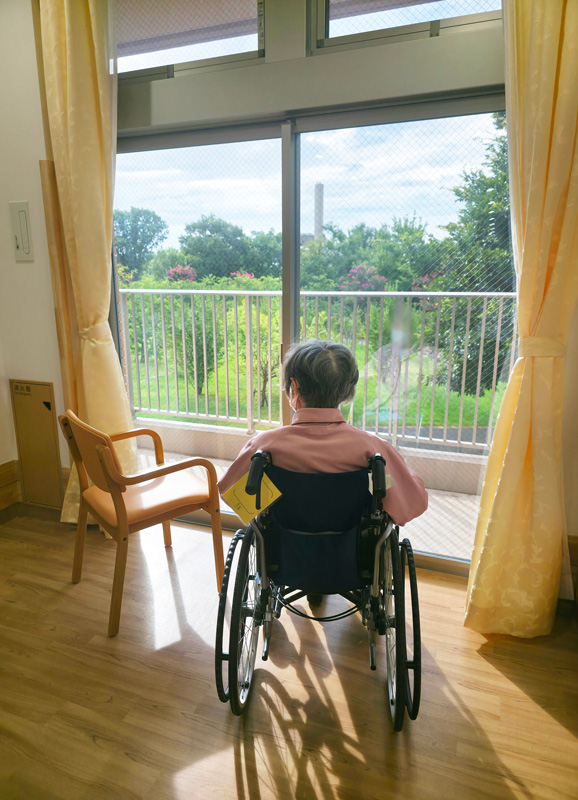 6:00に廊下やお部屋の電気をつけさせていただきます。朝食までの時間は、整容や身支度をするなど、思い思いに過ごしていただいております。病棟東側の窓からは、自然が多い広大な公園が望めます。