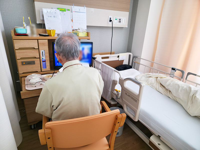 8:00に朝食となります。食事は、患者様の状態に合わせて、栄養量や食形態が工夫されたものが提供されます。仲良くなった方と、テレビを見ながら朝食を召し上がる方もおります。