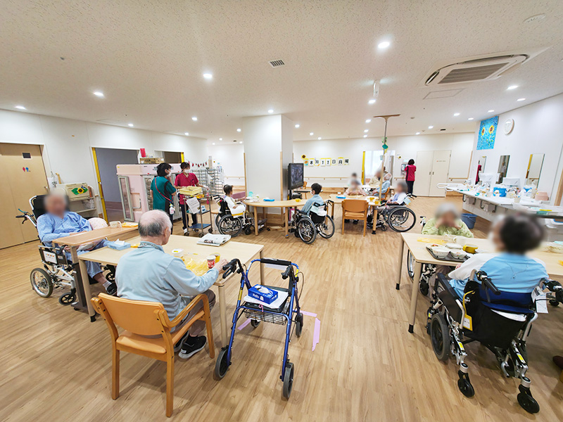 18:00に夕食となります。大勢で集まり、テレビを鑑賞したり、音楽を聴いたりしながら食事を召し上がっていただきます。食事姿勢の調整や食事の手伝い、食後の整容は看護・介護スタッフが関わらせていただきます。