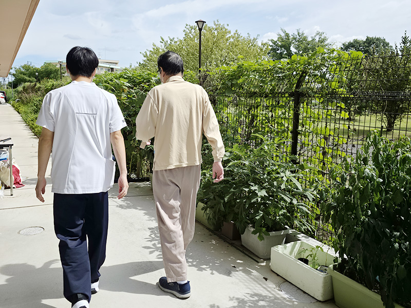 私たちスタッフは、退院された後の暮らしを支えるお手伝いをしていきます。ひとりひとりの個別リハビリのほか、みなさんで参加する体操やレクリエーション、日常生活に必要な動作を、運動機能の具合を見ながら日々練習していく環境をつくっています。
