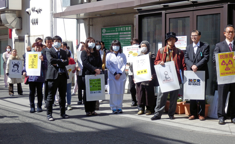 原発事故を風化させてはならない、原発再稼働を許してはならない。震災から3年目の2014年3月11日には、立川相互病院前などで職員約100人が思い思いのパネルを掲げ、原発ゼロを訴えた。
