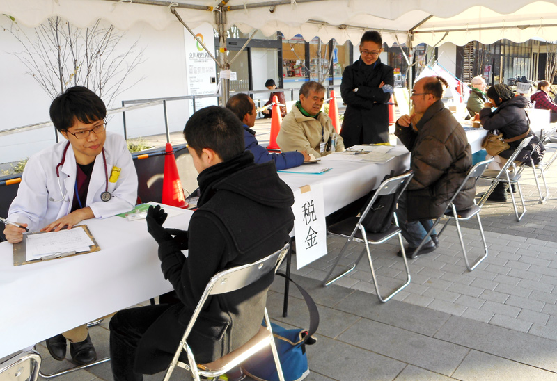 「生活相談、労働相談などお困りごとに、専門家が無料で相談に乗ります!」──立川駅周辺で「立川なんでも相談村」無料街頭相談会を開催し、健生会職員はじめ、弁護士、税理士などボランティアが、地域の方々からの相談にのっている。2010年12月~2019年12月で30回開催し、相談件数416件・生活保護申請45件である(2020年よりコロナで休止中)。活用できる制度の紹介や、さらに詳しく相談するための窓口などへつなげてきた。コロナ拡大以降は、「コロナ災害を乗り越えるいのちとくらしの電話相談会」として活動を継続している。