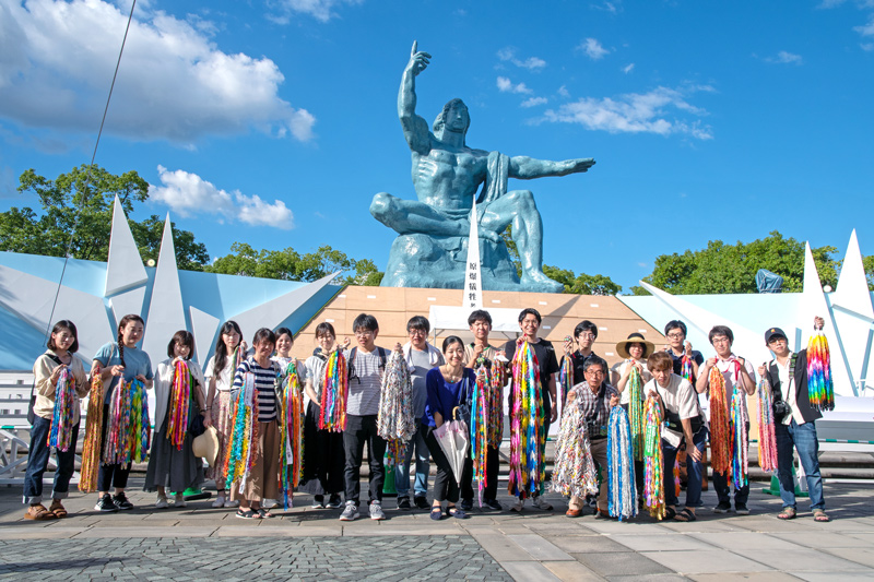 長崎平和公園の平和祈念像の前で、2019年の代表団メンバー。