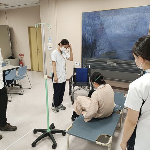 講義の後には実技を行い、たくさんの管がついている患者さんが、ベッドから車イスへ移乗する際の大変さを体験しました。また、ガウンの着脱では介助者と着用者に分かれ手順に注意しながらガウンテクニックを学びました。