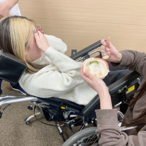 介助の際は視線を嚥下食に向けさせ、顎が上がりすぎないようにするポイントを伝えました。