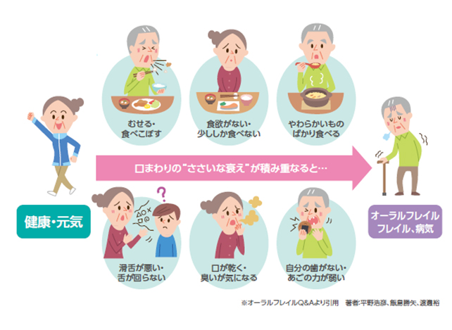 そして、口腔機能低下症とは口腔内の機能(咀嚼、嚥下、構音、唾液、感覚)が低下していく症状です。原因は主に加齢ですがその他にもさまざまな疾患や障害などが要因にあります。お口だけではなく全身の筋力が衰え、特に高齢の方は要介護状態につながります。