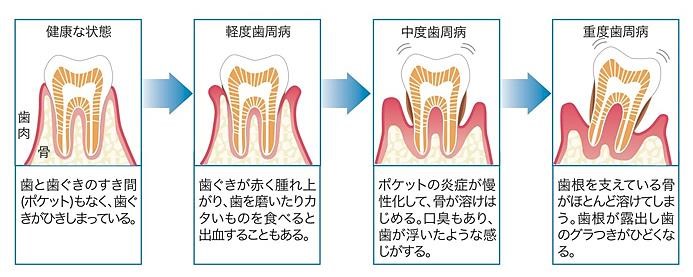 歯周病は歯茎の腫れや痛み、歯を支える骨が壊れる病気です。