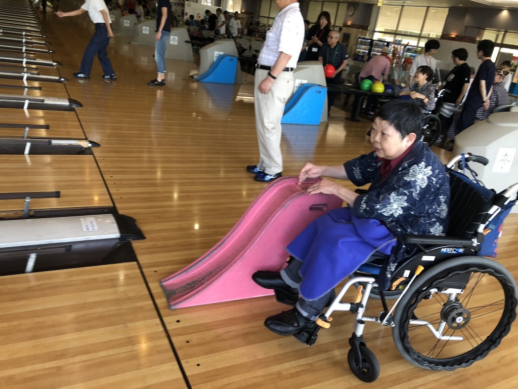 ボールを投げられない方は、投球補助台を使用します。ボーリングはほとんどやった事が無いという方も、ストライクやスペアも出て大盛り上がりでした。ご参加いただいたみなさま ありがとうございました。健生会ふれあい相互病院 リハビリテーション科(行事担当)
