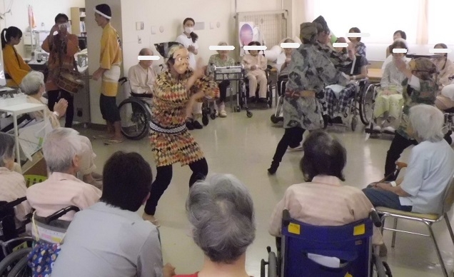 最後はリハビリ室を会場に、お囃子に合わせ、愛嬌のあるひょっとこ達、