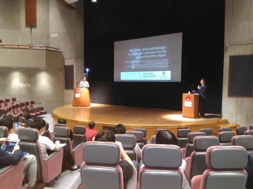 早稲田大学スポーツ科学技術院教授・金岡恒治先生とQueensland大学教授・Paul W Hodges先生が講演をされました。金岡先生は最近の研究の紹介をされ、最近注目されているsynergyについて説明されました。Hodges先生は「股関節と脊柱の機能的関係」「大腿臼蓋インピンジメント(FAI)」「gluteal tendinopathy」「腰痛」について講演されました(通訳付き)。日本とオーストラリアでの研究法の違い、体格差による影響、評価法等々、どの内容も興味深く、大変勉強になりました。