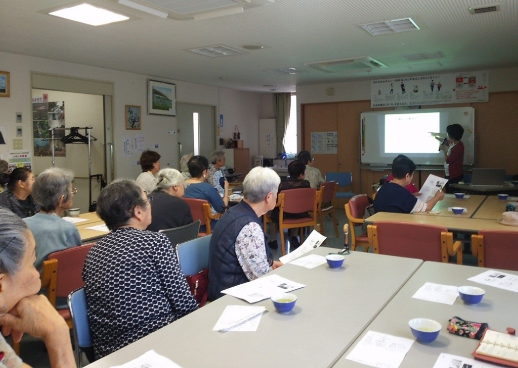 以前はデイサービスで使用していた場所だそうで、部屋の隣には厨房とお風呂もありました。想像以上に広い部屋だったので、スライドが見えにくいかなと心配でしたが、みなさん熱心に聞いてくださいました。後半は嚥下体操や歌をうたって、最後は「エイエイオー!」の掛け声でにぎやかに終了しました。