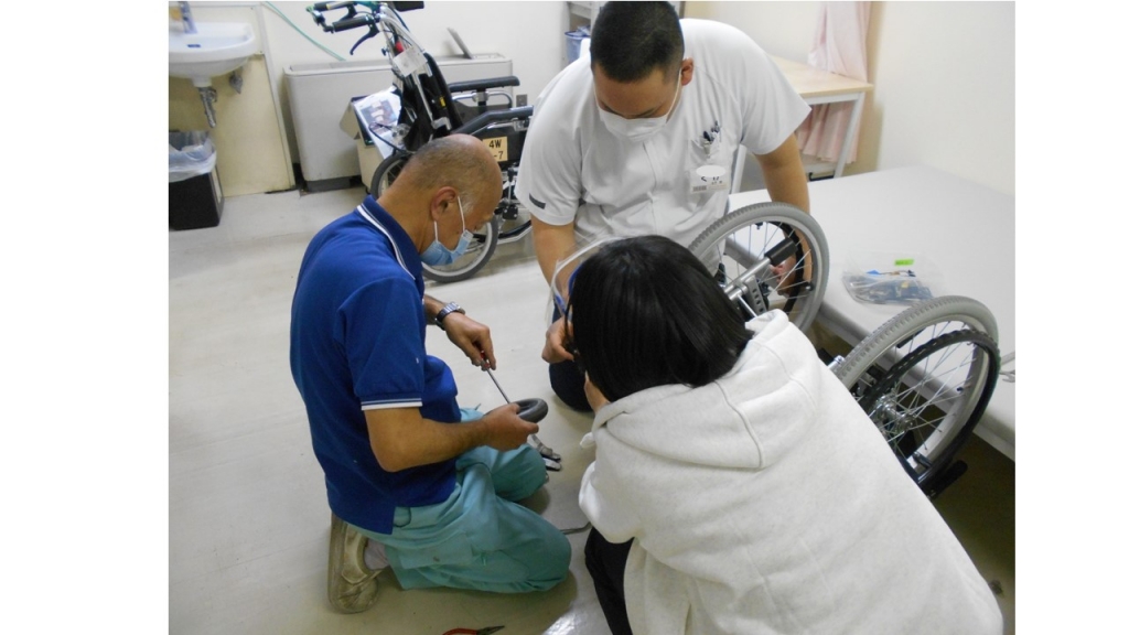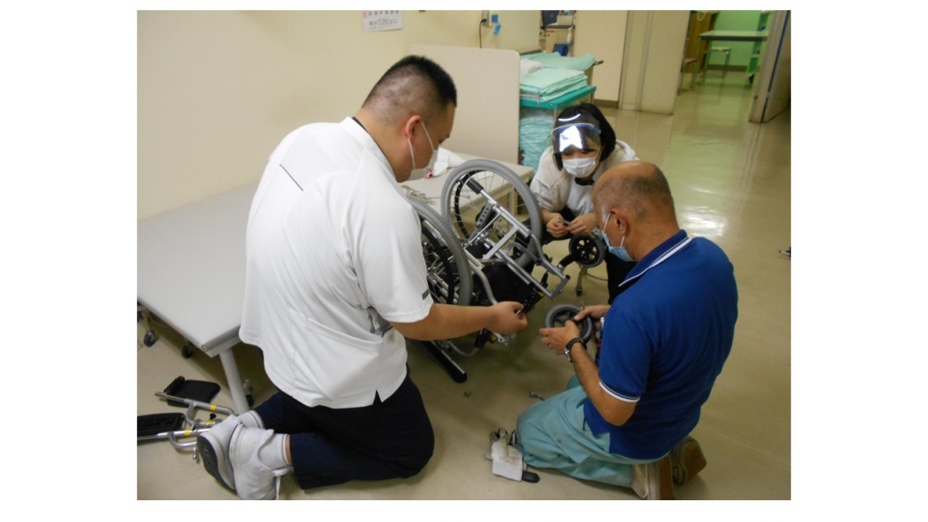 モジュラー型車椅子は患者様の体型に応じて座面・肘掛け・前輪後輪の調整が出来ます。