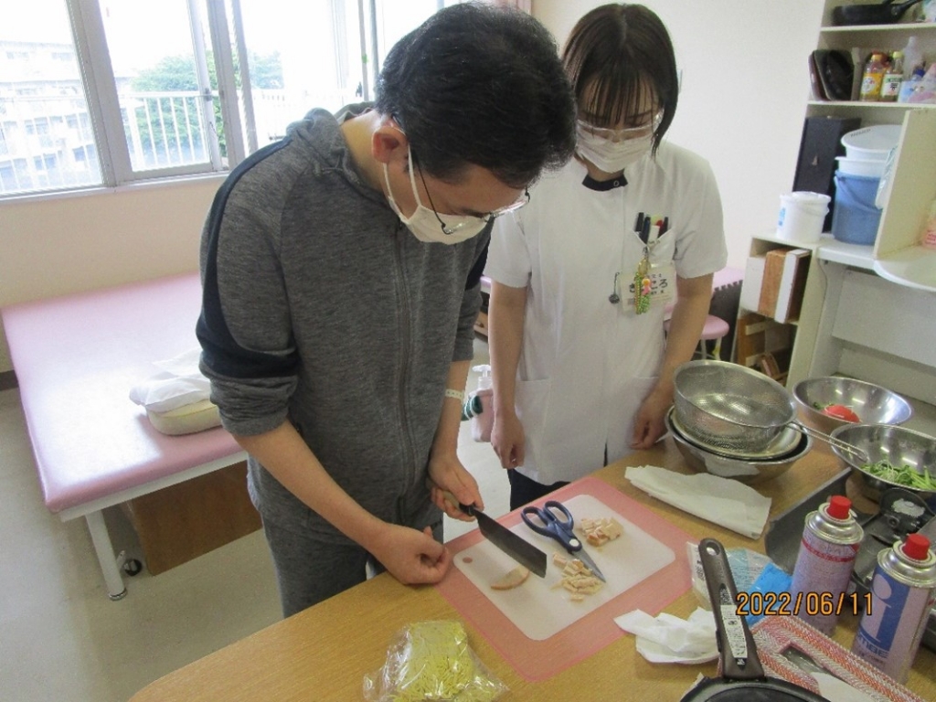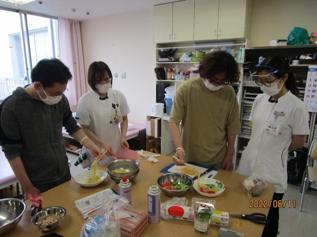 片手の調理訓練最後は、2名の患者様が合同で冷やし中華を作ります。