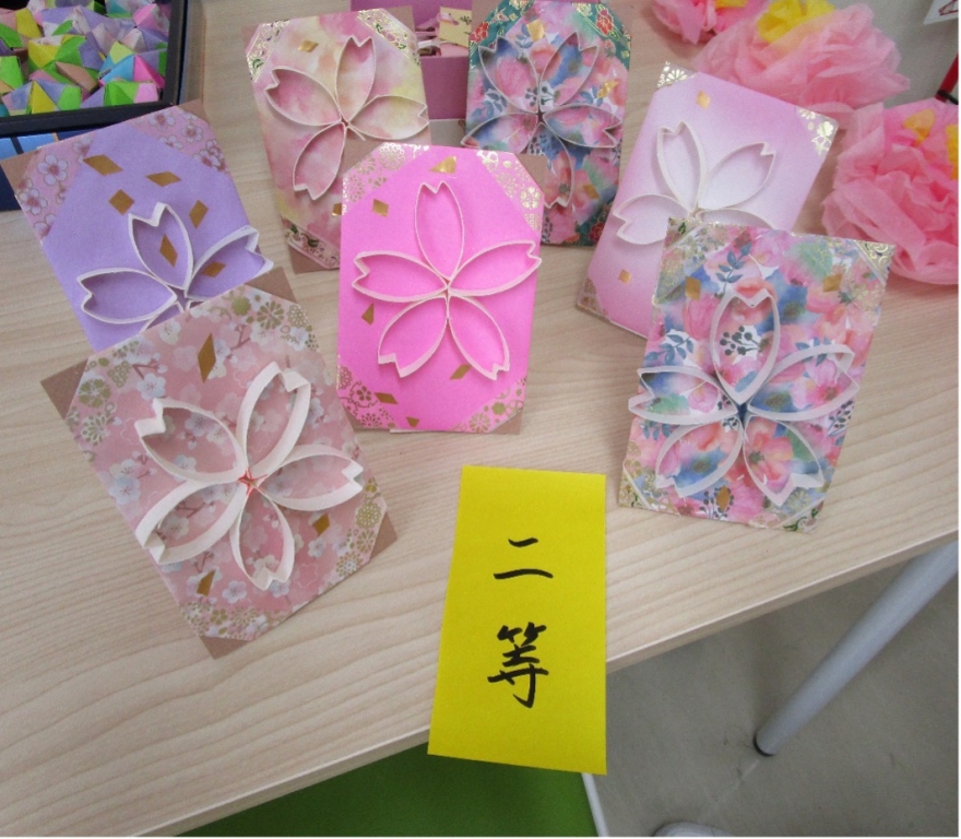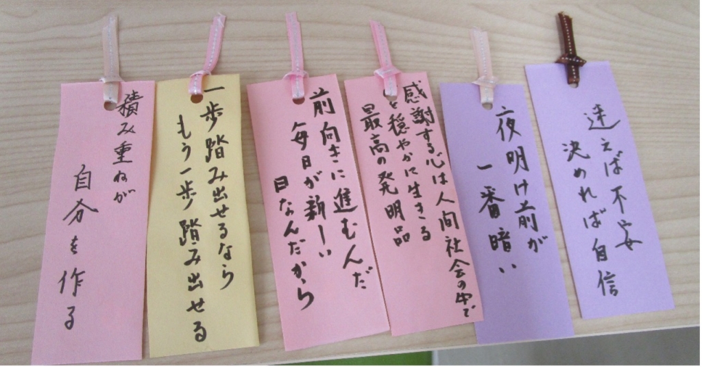 景品は全て患者様の手作りです。栞の言葉も筆ペンで、一つ一つ手書きして下さいました。