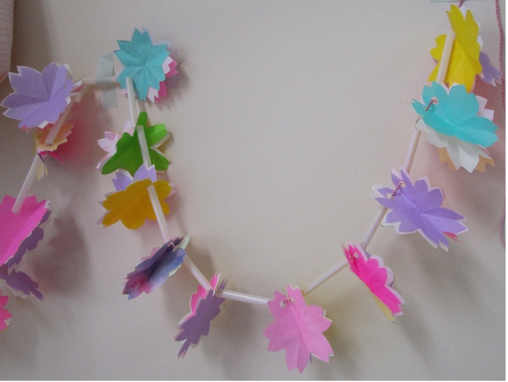 このガーラントも、桜の花びらを折り紙で切り出し、重ね貼りして作っています。