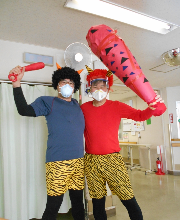健生会ふれあい相互病院 レクリエーション係です。レクリエーション係は、セラピスト・看護師・介護福祉士で構成されています。2月2日に『節分・豆まき』を開催しました。入院生活の中でも、季節の変化を感じられるよう日々工夫しています。患者様は、鬼に扮したスタッフに向かって、勢いよく豆まきをしていました。