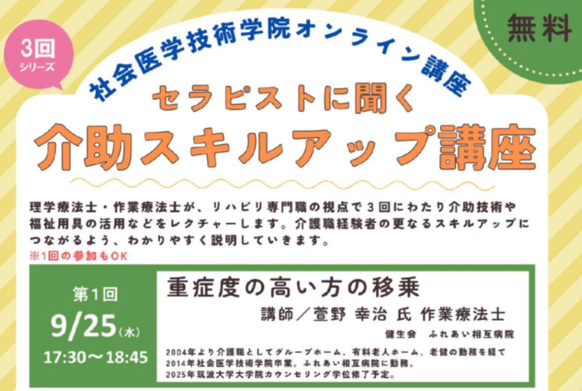 理学療法士と作業療法士の専門学校である社会医学技術学院で介助スキルについてのオンライン講座が行われました。介護職の方向けのセミナーです。