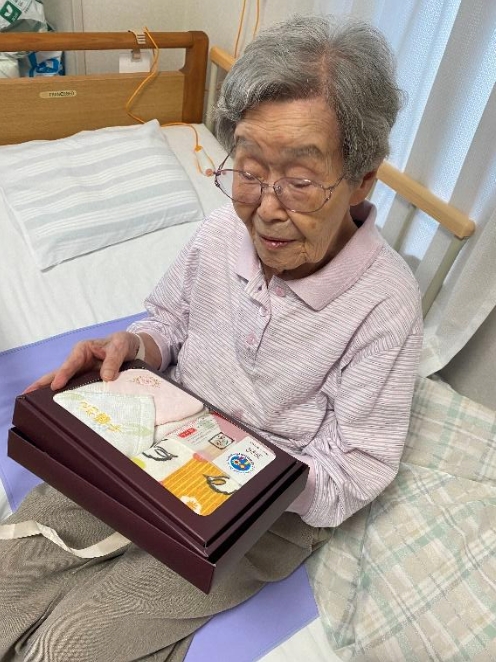 100歳を迎えられた患者様へ、心ばかりのプレゼントを贈らせてもらっています。