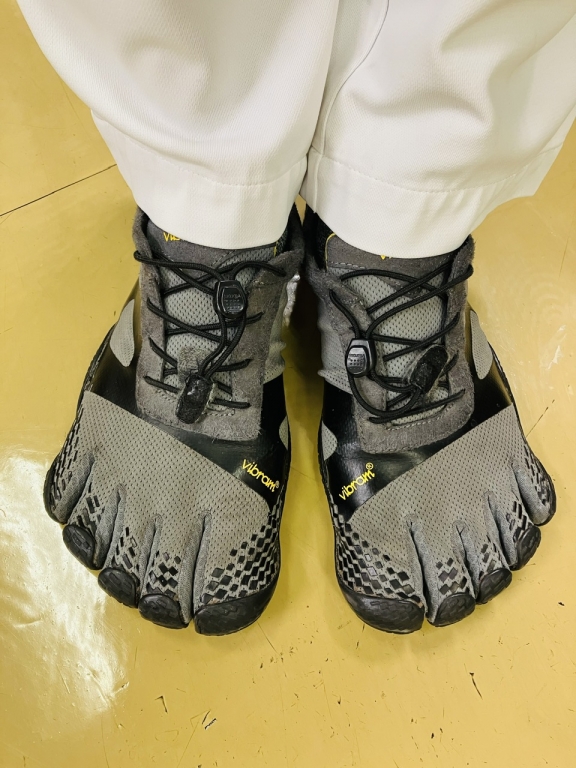 下の写真は見た瞬間に衝動買いをした5本指の靴です。指を自由に動かせ、足底の感覚を大切にするために底が薄いので慣れるのに時間がかかりましたが、今では仕事中に履いています。患者さんから面白い靴履いているねと褒められる?こともあります。流石にこちらを履いてる方は少ないですが、それでも健生会の職員にもお仲間を見つけました。その方はトレイルランニングに使われているそうですが、私は院内の階段を医局のある7階まで歩いて登る様にしています。呼吸を意識しながら、半年も続けて上り下りする中でだいぶ慣れてきました。今年は還暦、足腰が衰えてしまわないよう筋力、持久力、バランス感覚を維持して、長く元気に働きたいものです。
