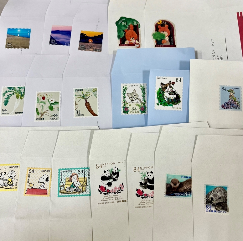 届いた封書に貼ってある切手、返信用封筒に貼ってくださっている切手など色々ありますが、可愛い写真や動物、きれいな風景、美味しそうなもの、懐かしいアニメ、「え?こんな切手があるんだね~」と思わずみんなに見せたくなるような切手etc…。いつも楽しみに見ています。