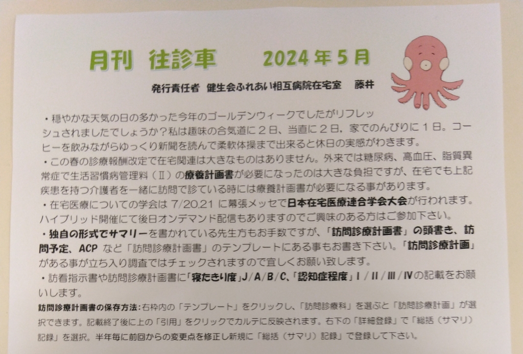 今回のざいたこだよりは在宅室長藤井医師が毎月作成している『月刊往診車』の事をお伝えします。