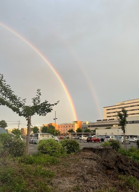 こんにちは。立川相互錦町クリニック在宅室 ざいたこです。もうすぐ梅雨が明ける、なんてニュースも出ています。梅雨と言うほど雨が降ったかな?と思えば連日大雨の予報もあり不安定な日々ですね。先日通勤路で大きな虹を見ました、しかも二重、ダブルレインボーです。虹は、太陽光が雨粒などの水滴に入射し屈折と反射を繰り返すことで光が分光されてみえる現象、二重に見える虹は副虹と呼ばれるそうで水滴内で2回反射した光によるもので色が反転してみえるそうです。