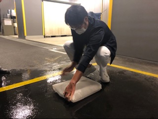 みんなで土嚢を実際に積む訓練をしたんだよ。